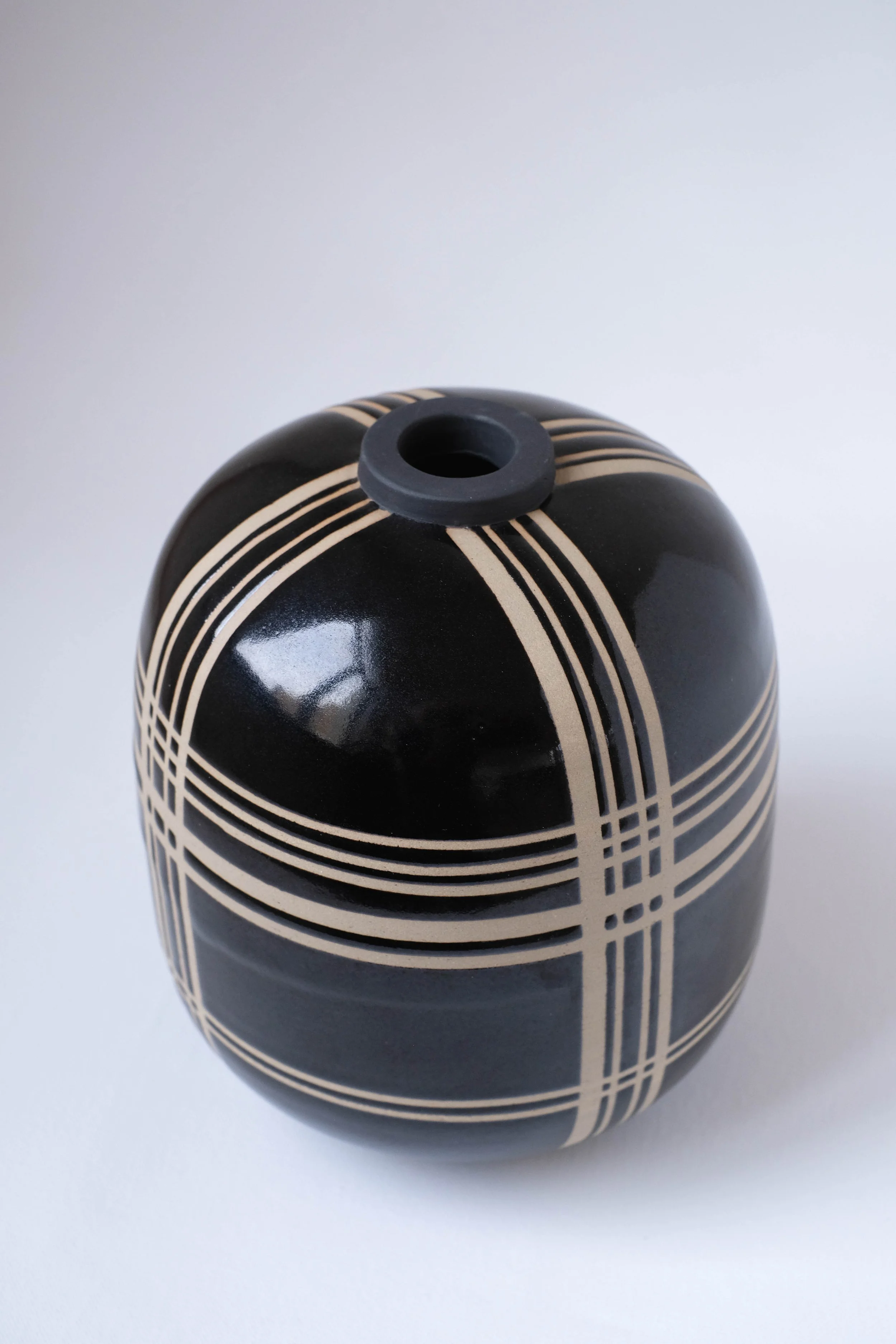 Stoneware cube vase by Ellcy Cieb, with stylised lines and dark glossy engobe.